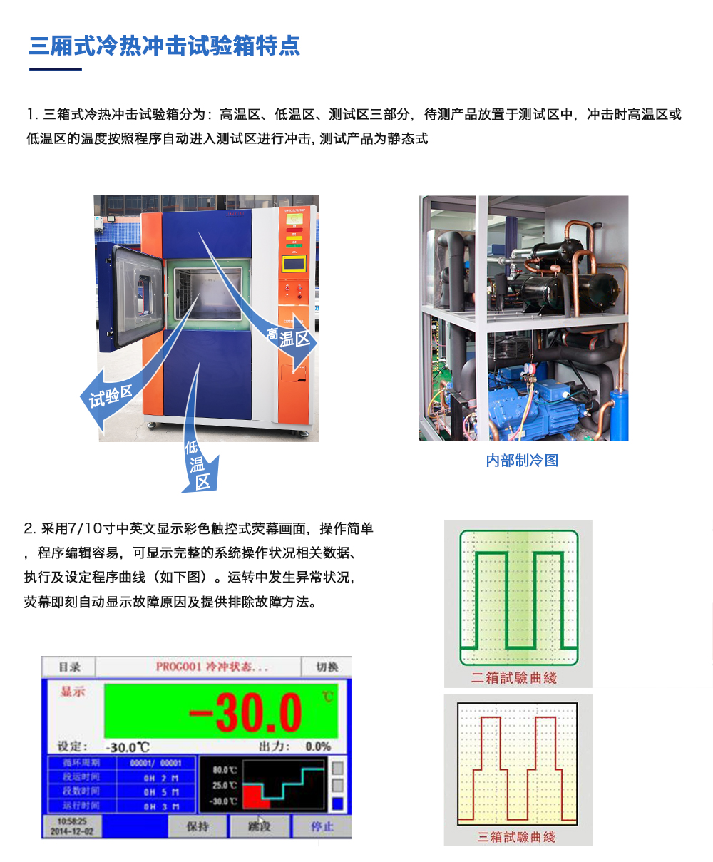 產(chǎn)品型號:JQTS3-408 品牌:劍 喬 用途:三箱式冷熱沖擊試驗箱又名溫度沖擊試驗或高低溫沖擊試驗是用于考核產(chǎn)品對周圍環(huán)境溫度急劇變化的適應(yīng)性,裝備設(shè)計定型的鑒定試驗和批產(chǎn)階段的例行試驗中不可缺少的試驗,在有咨詢熱線:13829135130